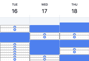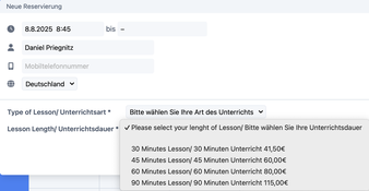 In den freien "+" Feldern kannst du deine Startzeit und anschließend deine gewünschte Unterrichtsart und Dauer wählen. Bitte versuche deinen Terminwunsch möglichst lückenlos an umliegende Termine anzuknüpfen.